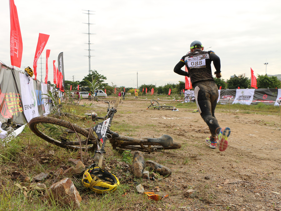 选手换项时要把自行车停放在指定位置,并换上跑步的鞋子。