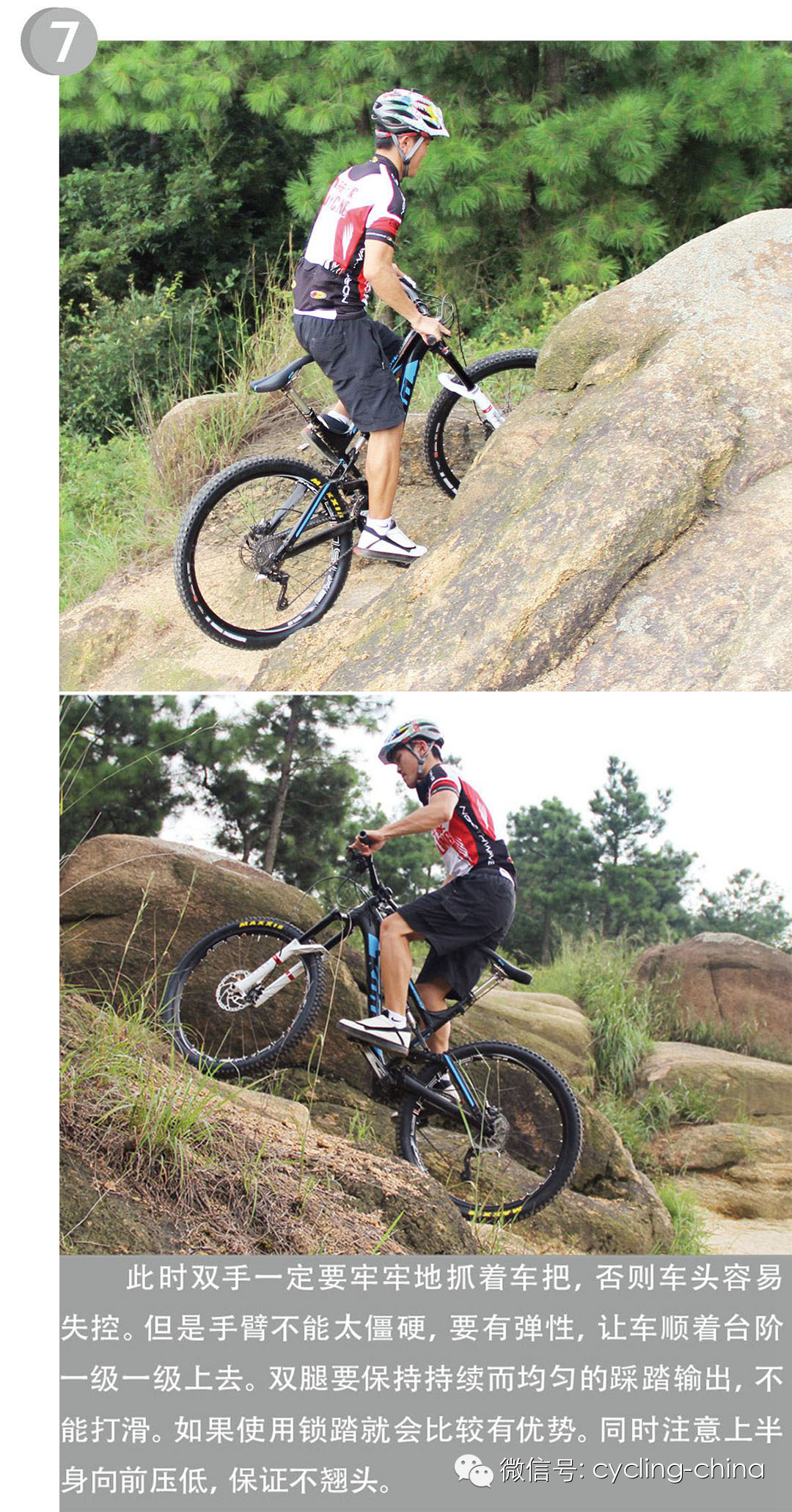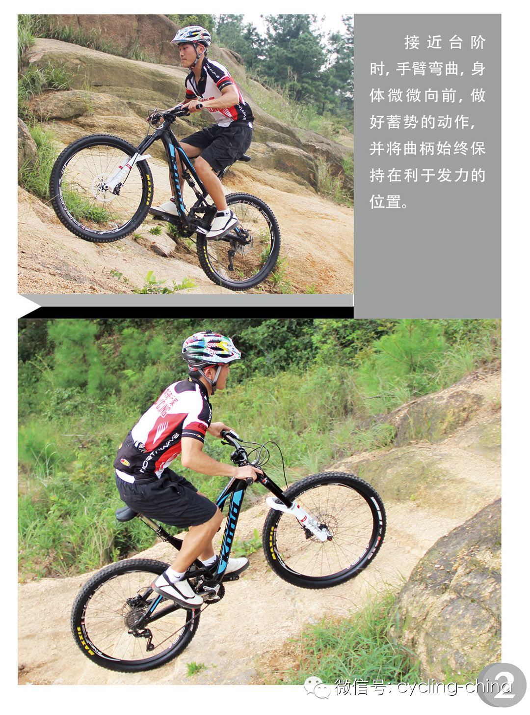 在山地骑行时,经常会遇到一些或规则或不规则的台阶或者类似台阶形态的障碍,拦住骑行者前进的脚步。对于刚入门的车友来说,哪怕非常平缓的台阶式障碍也会下 车推行。也有些车友掌握不好上台阶的技巧,经常会造成磕圈、破胎的后果。其实骑台阶并不复杂,只要掌握了技巧就能轻松应对,视台阶为平地,为骑行增添不少 乐趣。