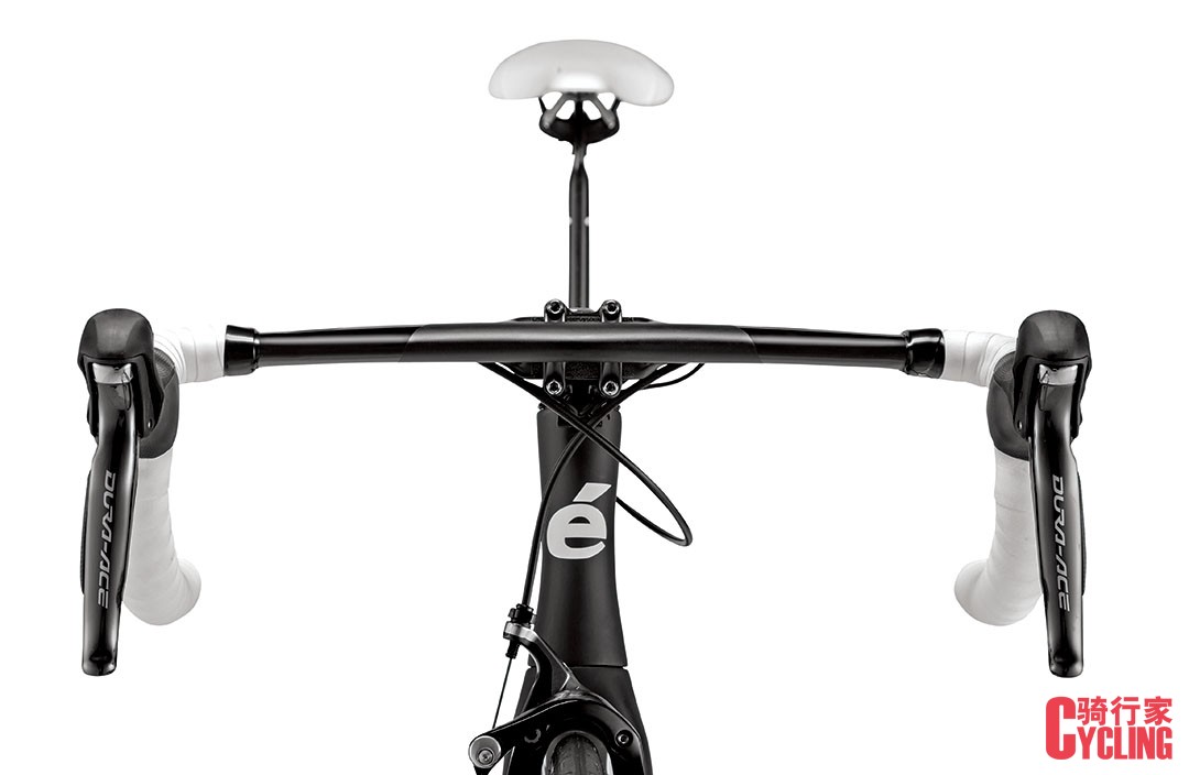 S5 Dura-Ace Di2整车最引人注目的无疑是那根Cervelo破风扁把,其锁紧方式虽然略显繁琐,但好处是用户可以自行搭配不同长度和角度的把立同时保证优异的空气动 力学。Jet 6+轮组的选用也是考虑到HED.很早就在空气动力学领域进行非常前卫的研究,率先步入宽圈的行列。HED.Jet 6+重1730g,作为60mm高的宽圈来说是一个非常好接受的数据,在平路赛段和铁三赛场上都有非常大的保有量。牙盘为Rotor 3D+ BB30规格,除了可以和Cervelo的BBright规格五通做最好的配合之外,非常方便加装功率计,这是公路车手必然会考虑的其中一个因素。变速套 件方面采用Shimnao DA Di2电变,方便走线也减少线管外漏。