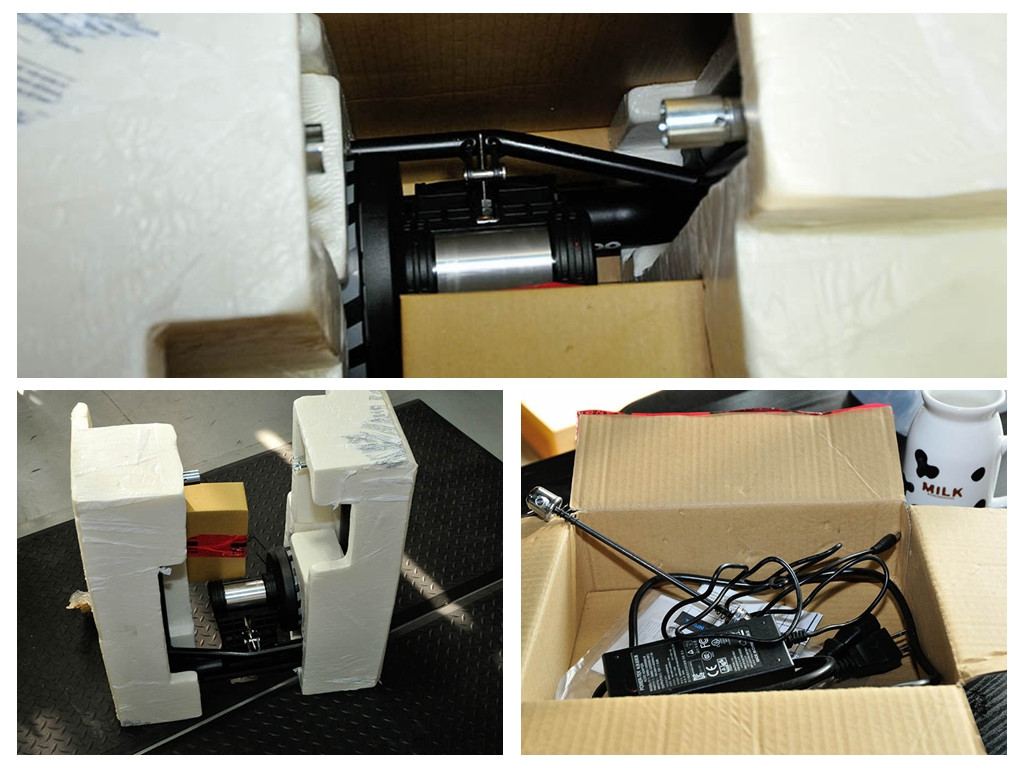 开箱,由于这货是在展位上拉回来的拆箱再打包的产品,笔者不敢确定原装是否还有其他保护填充物,反正该有的东西一件没少。电源线、专用快拆、说明书,还有骑行台本体。