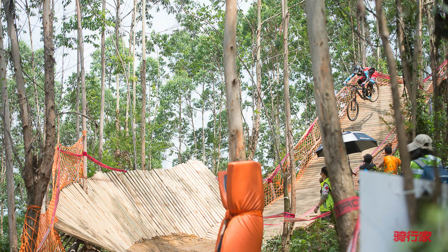 万幸的是,我们终于在比赛当天(5月21日)的凌晨1点钟赶到了此次比赛的举办次——恩平泉林小镇,并且在白天迎来了久违的阳光。此次赛事组委会特别邀请了UR Polygon车队的南非车手安德鲁·尼斯林(Andrew Neethling)、特蕾西·汉娜(Tracy Hannah)以及多名亚级顶级的速降选手参加本次比赛。其中最具代表性是2015年的亚锦赛冠军,中华台北的江胜山;日本的速降传奇人物清水一辉,曾获2012年的亚锦赛冠军、14、15年亚锦赛亚军;韩国的速降一哥李辰永(Lee Changyong),他是10年的亚锦赛冠军。除了中日韩大战这个看点,还有来自瑞士的前国家队队员马库斯(Markus Ruchti),实力也不容小视。除此之外,来自巴西、印度、香港特别行政区、中华台北以及中国内地的其他选手都代表着他们国家和地区的最高水平。