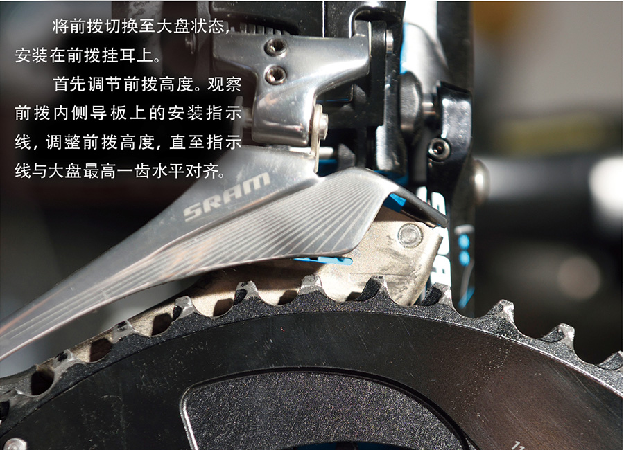 接着调节前拨偏航角度。观察前拨导板上方的指示线及内外侧导板下方连接处的指示线,调整前拨角度,直至大盘盘齿的连线与前拨上下两条指示线的连线重合。随后锁紧前拨安装螺丝。