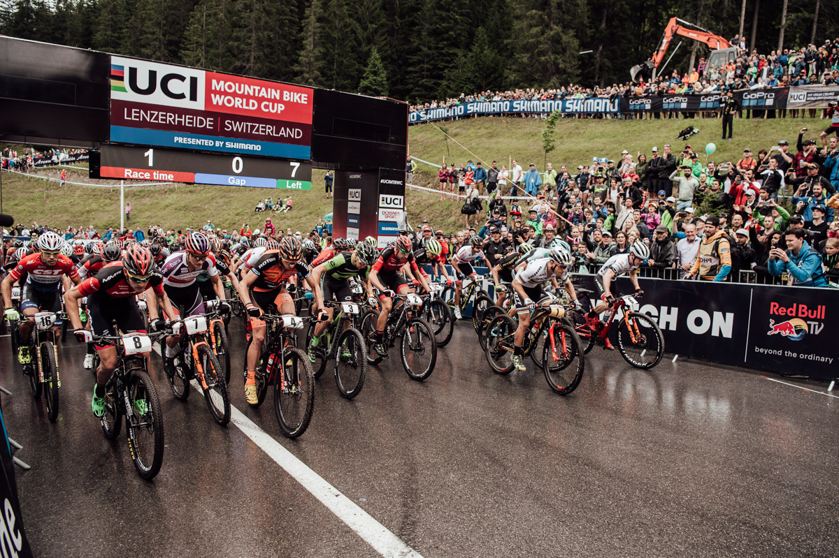 一夜的大雨让伦策海德的赛道变得异常泥泞以及湿滑,遍地的树根是车手们最大的威胁,因此组委会将男子组的比赛从8圈变成了7圈。在上一站热身时摔伤锁骨的阿布沙龙也现身赛场,我们也期待老将早点康复。