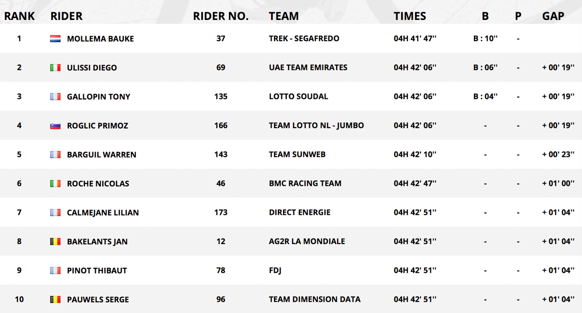 第7次参加环法的鲍克·莫莱马(崔克-世家兰铎车队)赢得了他职业生涯的首个环法单站胜利,“真的太棒了,很高兴能够获胜,在过去几年我一直为之努力,是我的一大目标。今天我在第一个爬坡尽了全力,尝试追上领先集团,最终我们做到了,这是第一步,接着我只要在最后30公里去尝试突围,不过一个人骑感觉骑了好久。虽然最后快要被追上,但我还是成功了!这是我职业生涯迄今为止最重大的胜利。环法一直是我的梦想,现在我开心到难以置信。”