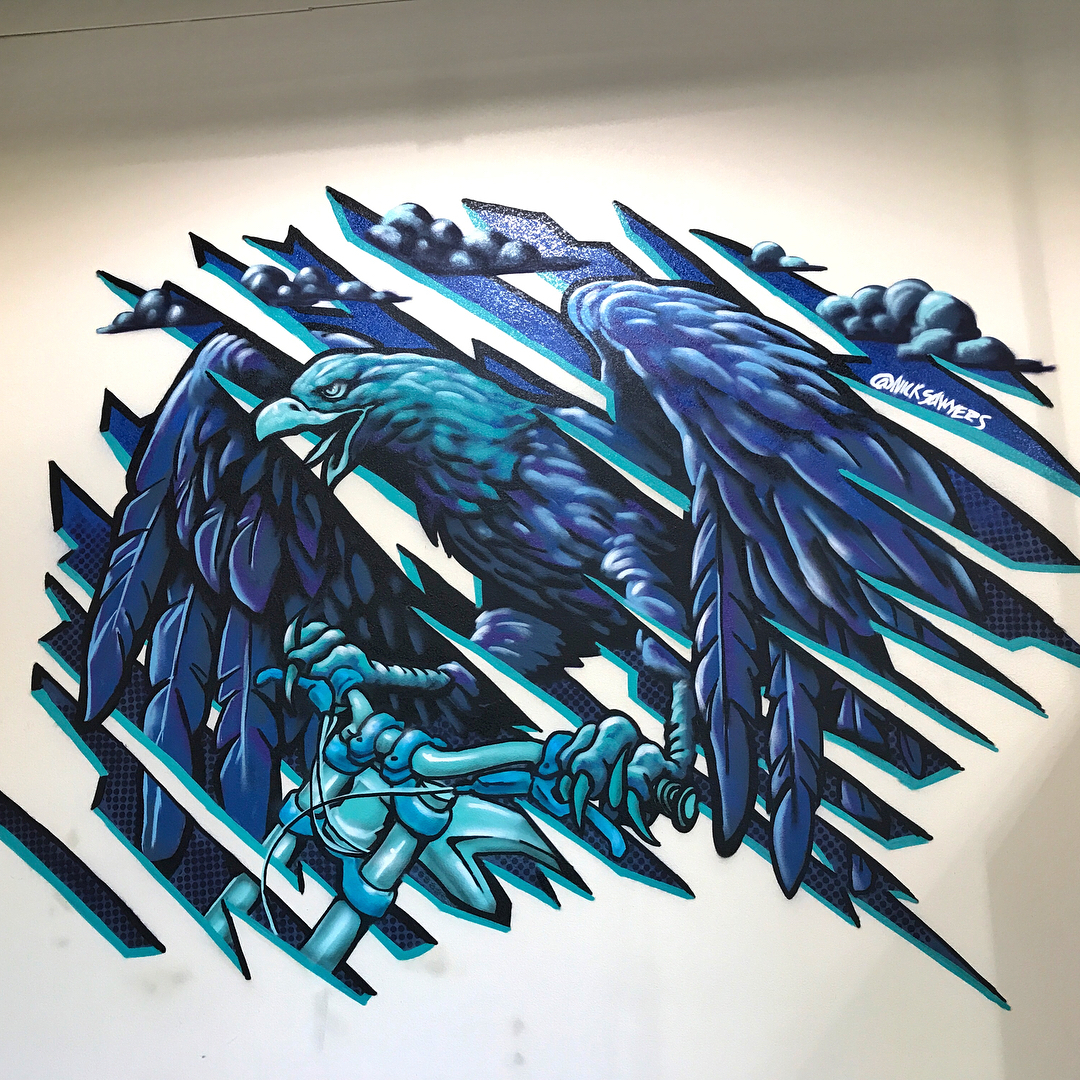 前几日,在Cam Zink的ins上晒出一组墙体涂鸦的作品,画作的作者是美国著名的商业插画师尼克·索耶斯(Nick Sawyers),而他这次的作品用了单色调来突出山地车主题。画中有飞翔的雄鹰、四驱越野车、速降车和车手,还有极具夸张的土坡场地...