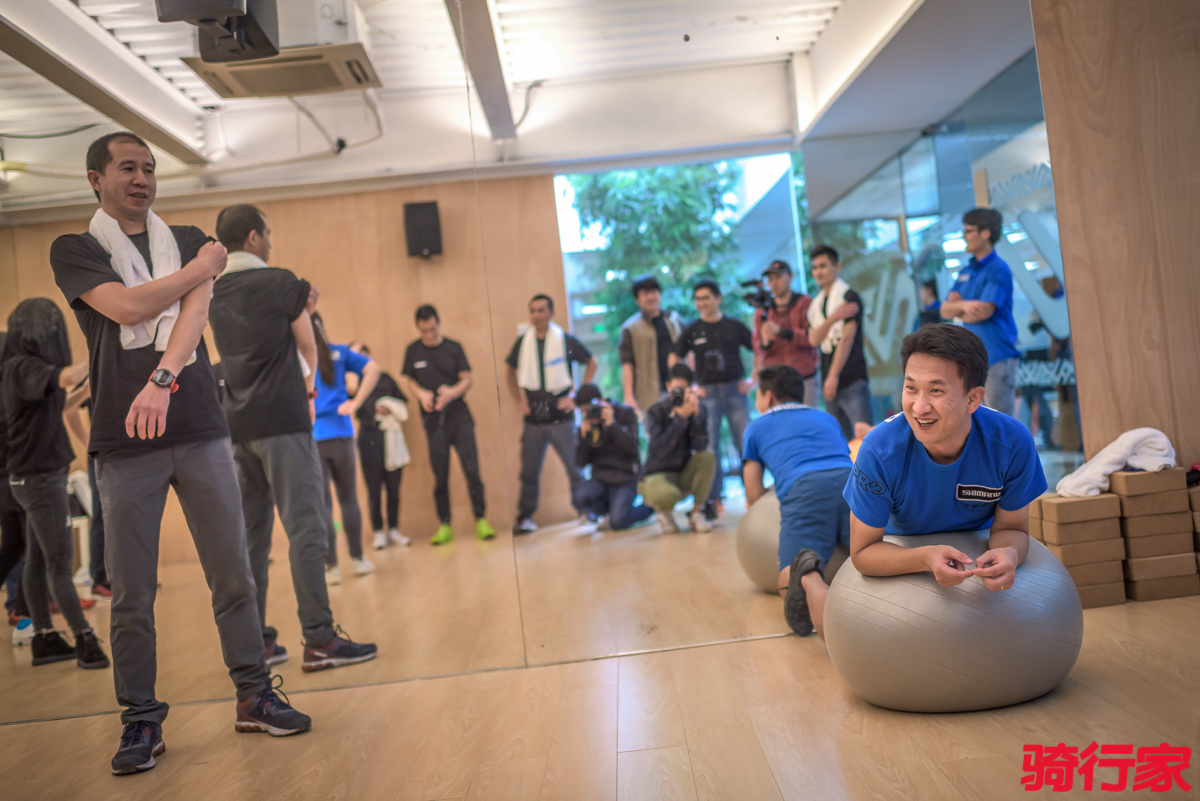第二天是计成真正亲身示范,帮助车友训练的开始。这一天,计成讲解了骑行训练的方法、重点以及一些训练误区。同时现场演示了核心训练以及力量训练的多种方式。在健身房中,瑜伽球、举铁等很多训练方法都是车友们之前很少接触的。而计成给了每一位参与的车友体验的时间,并且尽量给每一个人以指导。