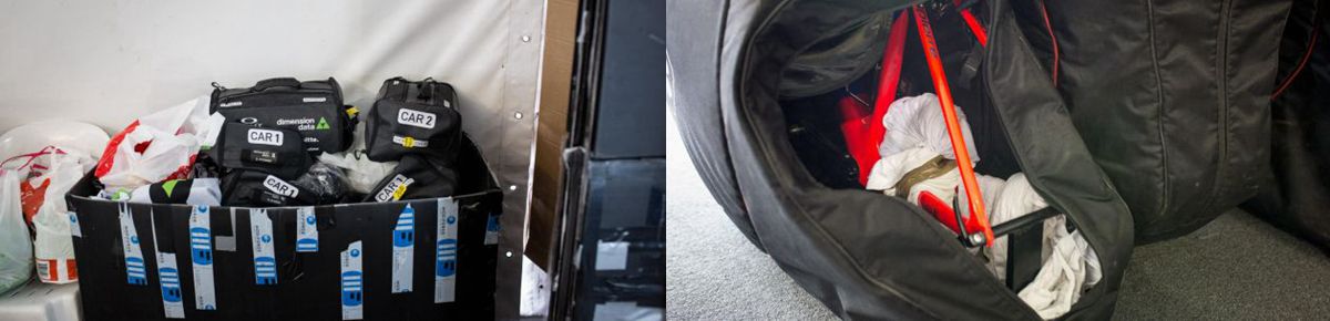 达科车队为车手们准备好了标有名字的赛事包,并且贴有相应的赛事车号码;FDJ车队用旧T恤打包装车。