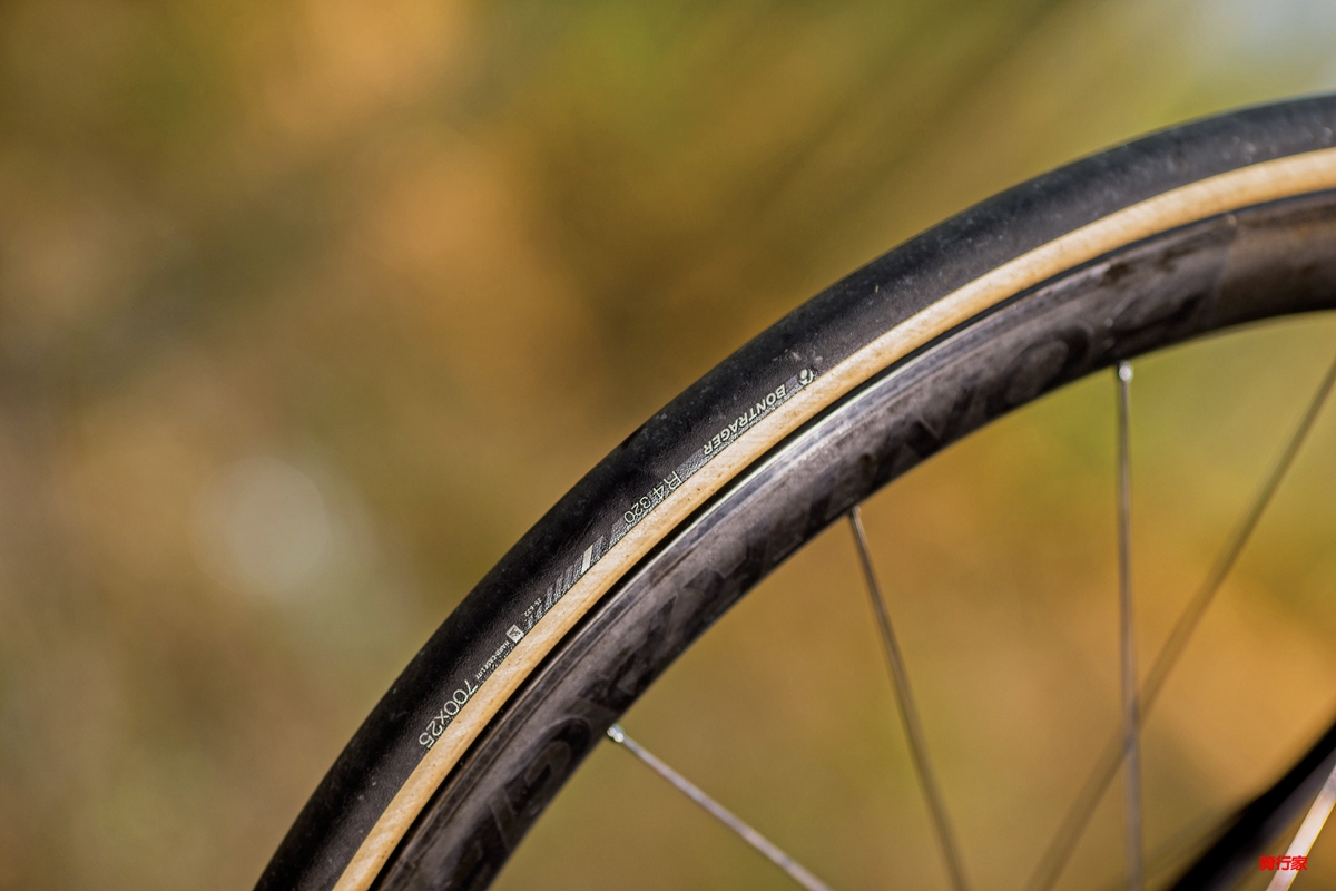 25c宽度的外胎非常符合目前的主流,安装在Bontrager Aeolus 5 TLR D3上感觉恰到好处,胎面也显得圆润丰满,绝对是一款在干燥环境下公路竞速的利器。