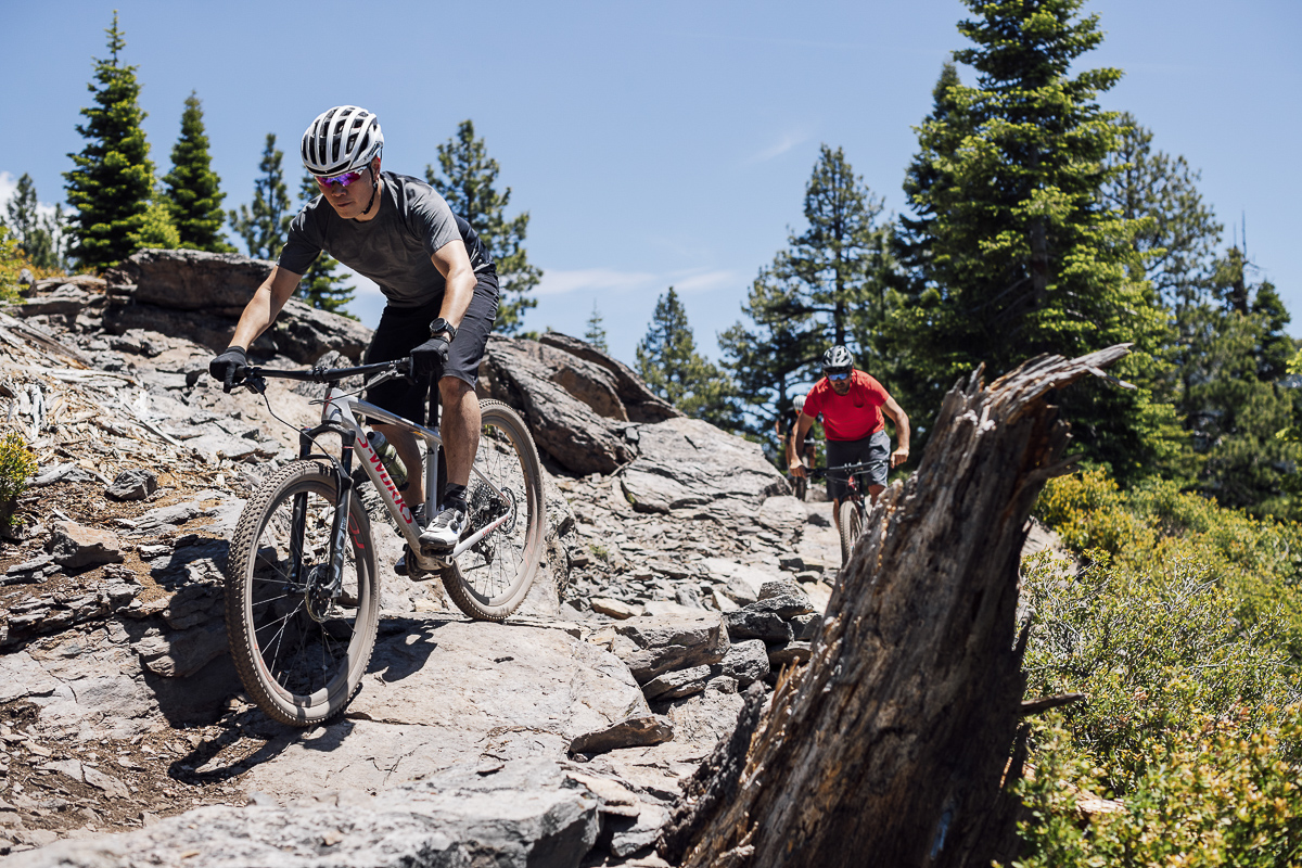 各种弯道、拦路的大石,小落差,以及在山岩和树干间穿行,还有从差不多三米高的陡峭巨型顽石顶上直角拐弯,然后顺着石面骑下来的“娱乐项目”。相当一部分的路,其路况复杂程度不比国内的Enduro低,实际上我们偶遇来这里骑行的美国车友,也都是Trail和AM车型。选择这样一条路来测试Epic HT,真是剑走偏锋。然而随着大家对车辆渐渐熟悉,记者们反倒逐渐嗨了起来。