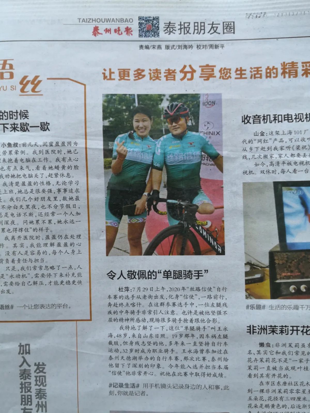 参赛的队伍中有一位选手格外引人注目,他就是来自山东日照的48岁的“独腿骑士”王永海,他所骑的是力敏纳Aero Flow风驰碳纤维公路车。19岁那年,王永海因遭遇车祸,左腿截肢,但他身残志坚,多年来坚持自行车运动,32岁时成为职业选手。他参加过泰州天德湖自行车赛,那次比赛对泰州留下了非常好的印象,本届“丝路信使”网上报名通道一打开,他就报了名,还发动不少朋友拉票,能参赛担当信使他非常开心。他的励志故事非常感人,多次被国内外媒体报道,有一次,他曾连续骑自行车50多个小时,从北京骑到沈阳,行程近700公里。他先后获得全国第七届残运会自行车项目五公里公路赛冠军,在哥伦比亚获得世纪残疾人运动会自行车LC3级别世界季军,感动日照十佳人物。