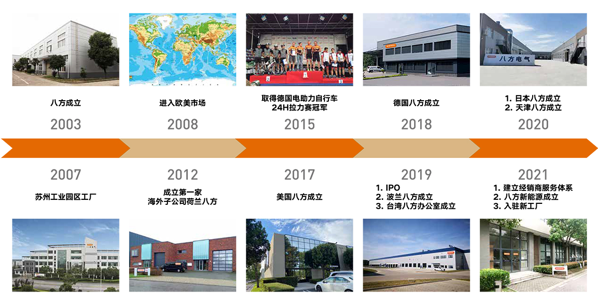 八方电气(苏州)股份有限公司(以下简称八方),成立于2003年,企业在王清华董事长的带领下,专注于开发电助力自行车及两轮交通工具的核心部件——电机、控制器、电池、传感器等驱动系统的核心技术研发、创造并成功投入生产中。在18年的时间里,八方以民族品牌形象傲立全球、拥有多项驱动系统核心技术,以其优质的产品享誉海内外。现今的八方已经成长为一家整套驱动系统的全球供应商,同时也是一家全球化的电驱动系统研发及制造的A股上市企业。