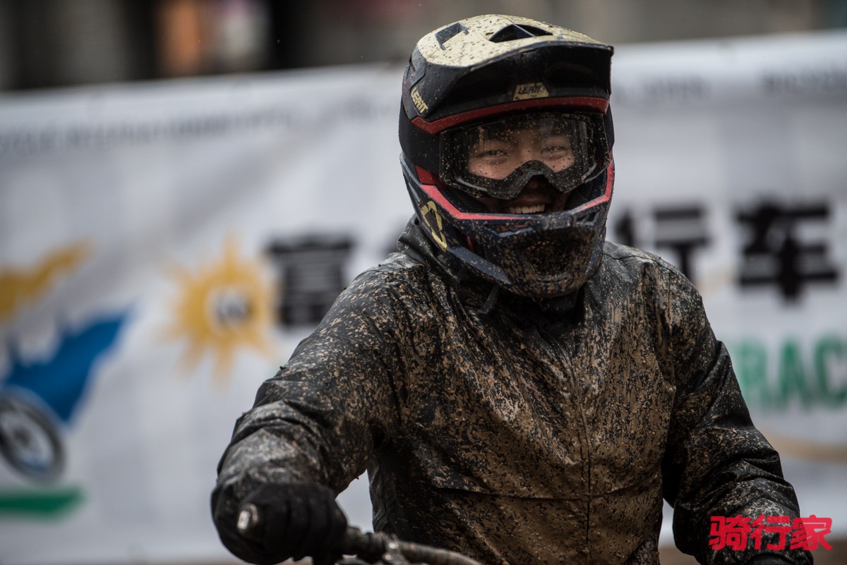 当下午的速降赛开始时,雨仍旧在下。注定要在赛道里“玩泥巴”的选手们也完全放开了,正式开赛前就欢脱地开始试起了赛道。这次速降赛的赛道由Bike Court的首席赛道设计师丁再刚设计,依托富龙滑雪场的地形,是一条全长约1.5km的绿线。这条绿线虽然在安全性上对于新手很友好,但要骑好这条赛道却也并不简单,赛道全程布满了弯道与起伏,想要流畅地骑完,需要你有足够好的山地车基本功。