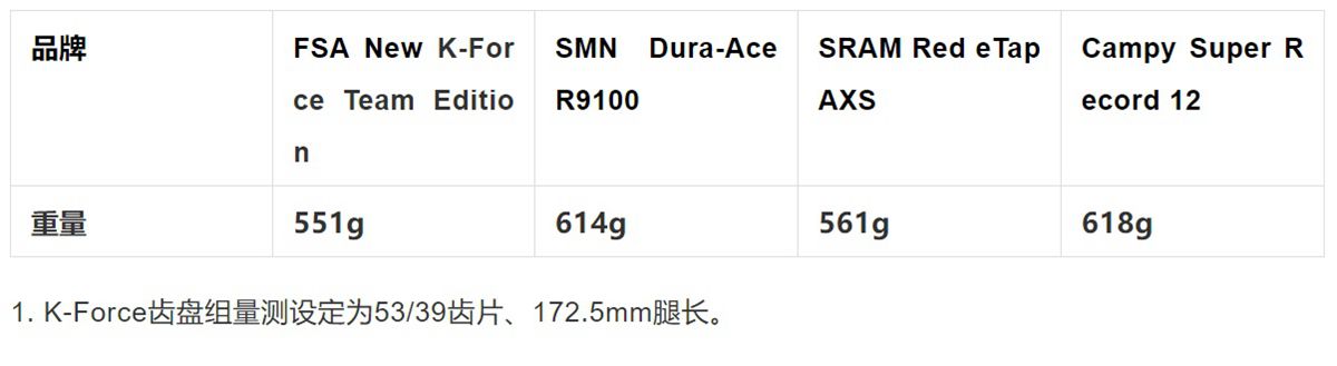 目前传动三雄(SMN、SRAM、Campy)的齿盘重量落在561-618克,而新改款的K-Force这次超车三位前辈,在轻量化略占上风。与DA R9100齿盘组相较,K-Force在重量上轻了67克,但等于轻量了12%,对于齿盘组属于转动惯量的零件,哪怕是轻量几十克,在经过百公里的骑乘、近万次的踩踏回转下,应能带来边际性能优势。