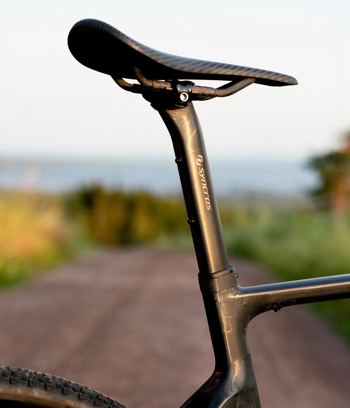 车架使用的是HMX碳纤的ADDICT GRAVEL TUNED,重量约为930g。配套的SYNCROS CRESTON IC SL X碳纤一体把,重量也仅为335g。车把前配有K-EDGE制作的佳明码表座。为了舒适性,把带选择了厚实摩擦力出色的SYNCROS GRAVEL BAR TAPE。