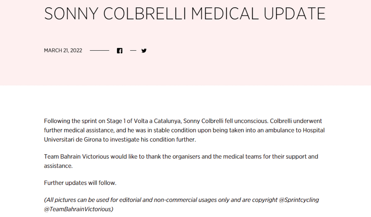 车队后来发布了一份补充说明:"在环加泰罗尼亚S1赛段的冲刺之后,科尔布雷利突然失去了知觉。他在被送上救护车前情况已经稳定,他将在赫罗纳大学医院接受进一步的检查。巴林-胜利车队对主办方提供的支持和帮助表示感谢。"