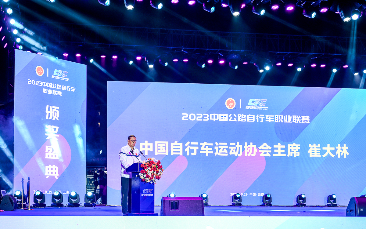 颁奖典礼上,中国自行车运动协会主席崔大林作2023中国公路自行车职业联赛总结致辞,文山州人民政府州长马忠俊、云南省体育局副局长张晓憬、西畴县委书记黄明勇分别致辞。