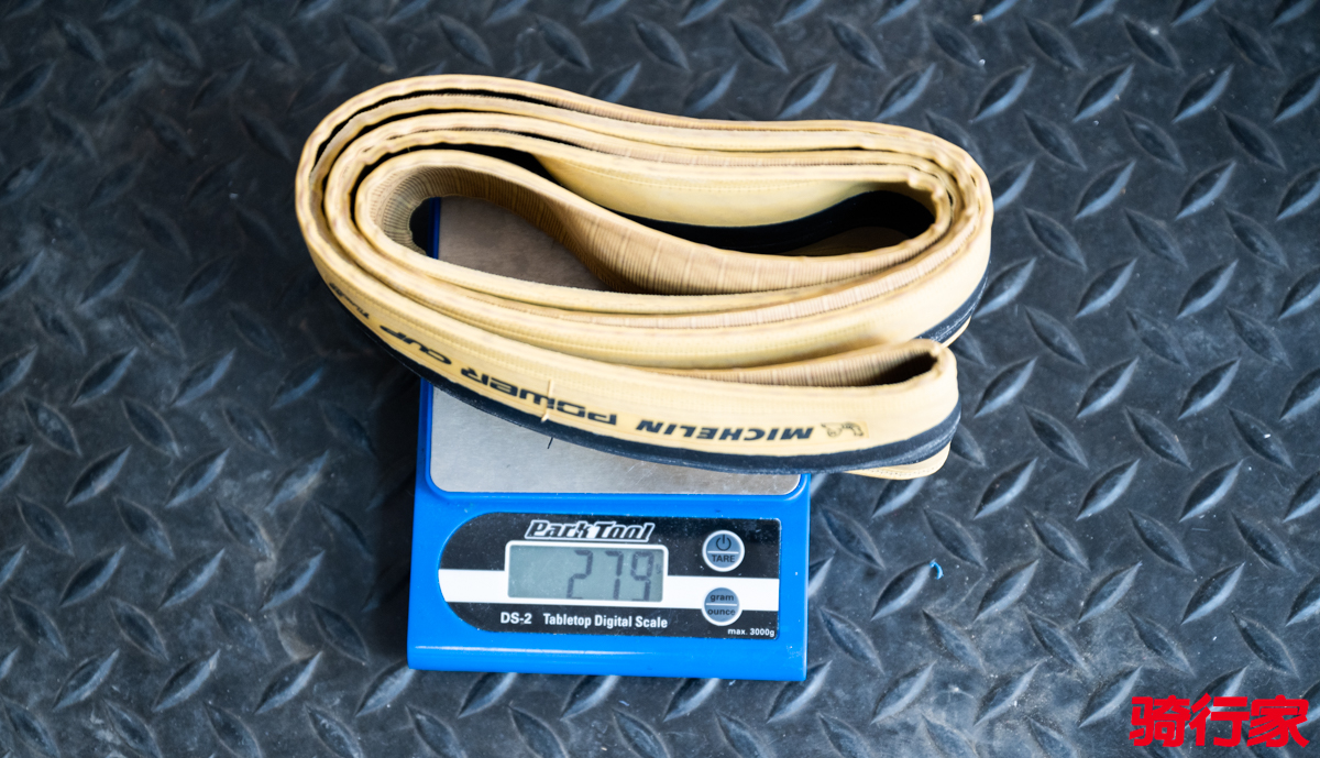 我们都知道,影响轮胎性能的几大因素:重量、滚阻、抓地力和耐用性,这都是我们在骑行时非常注重的几大因素。重量方面,这条28c的真空轮胎实测279g,这种重量和我们此前所测试的Pirelli P Zero Race TLR SL轮胎重量差不多,实属出色,毕竟Michelin这条轮胎还有一层覆盖了全胎面的Tubeless Shield防穿刺层,而倍耐力的Race TLR SL为了轻量化而并未使用防穿刺层。