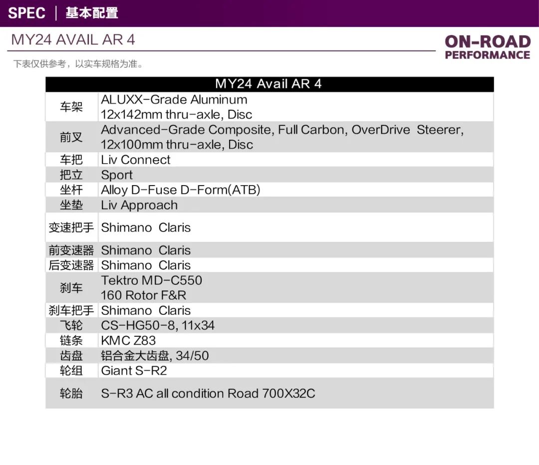 AVAIL AR 系列产品采用ALUXX材质车架以及碳纤维前叉,使车身整体轻量化;专为女性设计的长途耐力型车架几何,适合喜欢长距离和长途冒险的女性骑友,带来舒适平稳的长途骑乘之旅。