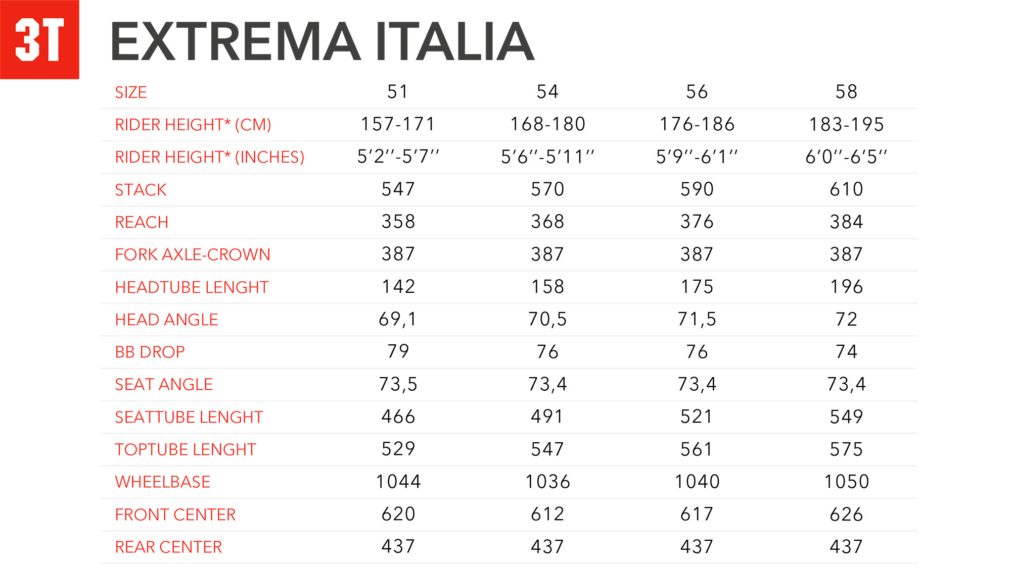 3T声称,未喷漆的54cm Extrema Italia Integrale车架在不含硬件的情况下重1100克。与相同尺寸的 RaceMax Italia Integrale车架相比,仅重了110克。前叉也同样轻巧,在未涂漆、不含硬件的情况下仅重420克,只比RaceMax Italia前叉重35克。