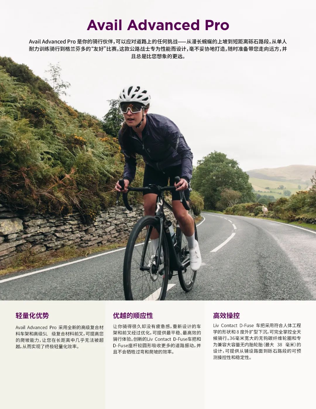 2008年,Liv推出的AVAIL是该品牌首款专为女性设计的专业级别公路车。创始人BonnieTu的坚持带来了创新,反复检查每一个细节,从车架几何的设计到零部件设计和选择, 打造出一台专业、彰显女性力量的公路车,并且能让你更长距离的骑行,和获得更多乐趣。 在当时,这种设计理念可能是一个很激进的想法,但正如AVAIL本身,一切都实现了。