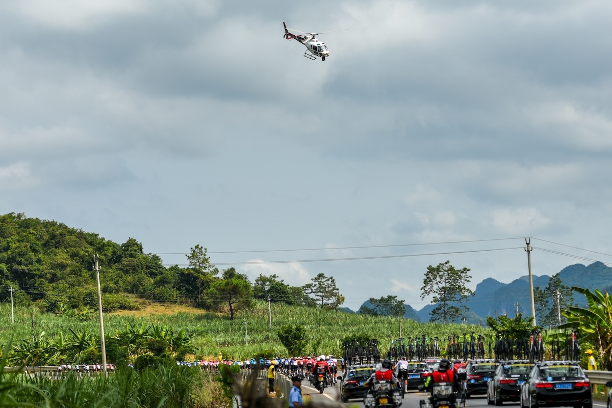 由于今天有两个爬坡点以及两个途中冲刺点,在比赛中表现积极有望第一个穿上爬坡王圆点衫,同时也有望争取冲刺王蓝衫,所以吸引了大量的车手突围抢积分和减秒。经过不断的拉扯和筛选,终于形成了一个稳定了8人突围小集团。
