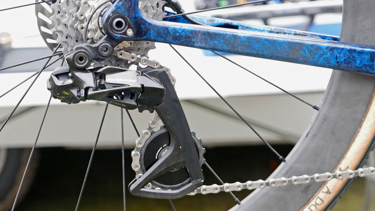 凑近一看,这款原型版产品和CeramicSpeed已发布的SRAM Transmission版大导轮系统一样,导轮是实心的,这样可以防止树枝卷入导轮中,这种设计应用在公路越野赛道合情合理。
