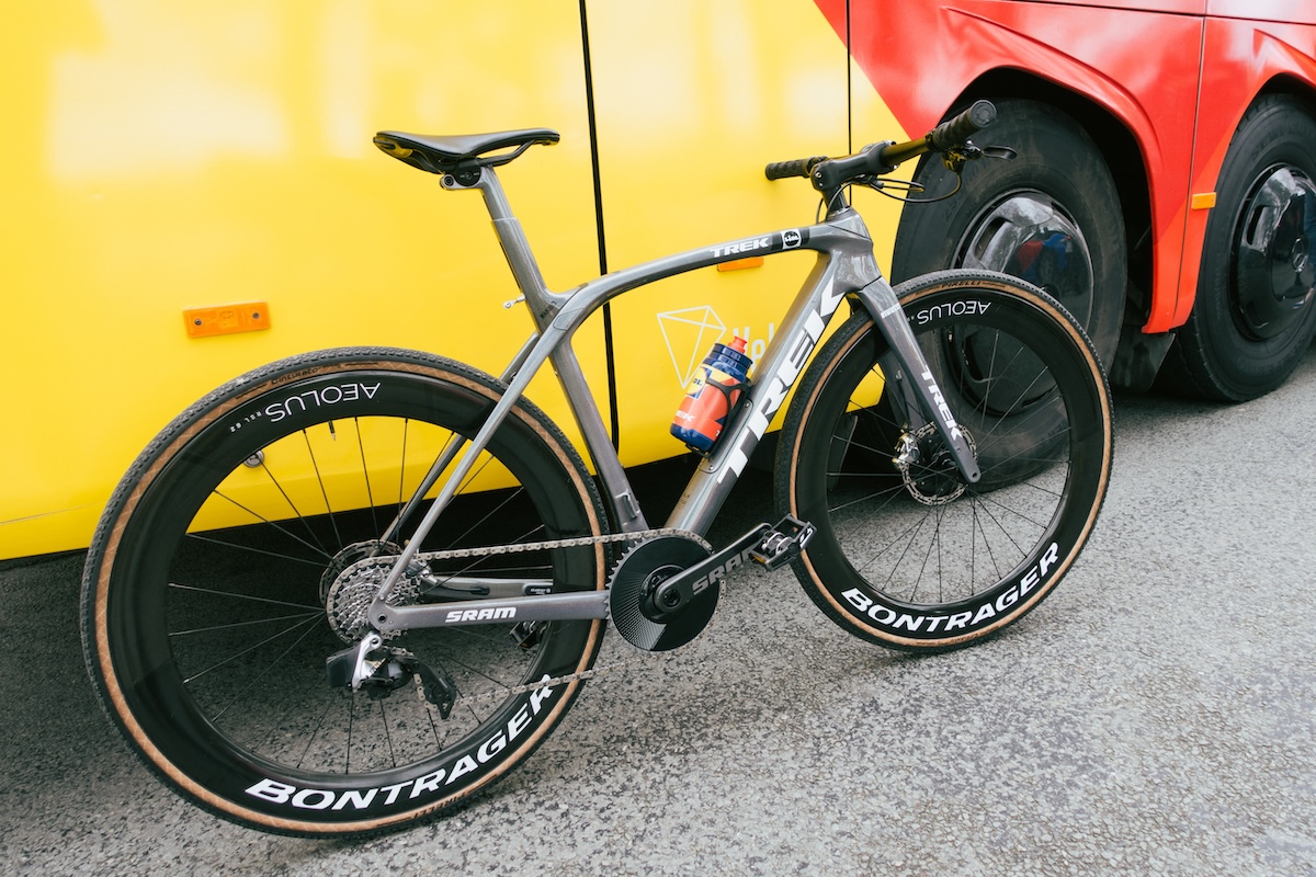 这才是佩德森的战车,一台气动公路——Trek Madone,选用56T单盘,搭配Gravel轮组以及暂未上市的原型版倍耐力轮胎。