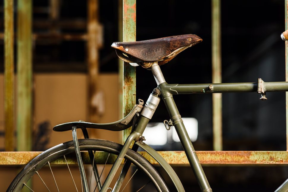 这个型号的自行车生产于1930-1950年间,是世界上最早的全避震折叠车之一,这是给意大利军队配发的,所以在上管上配有挂枪支架,还有一个用于负载士兵装备的货架。所有东西都必须非常可靠,所以握把是木质的,由Pirelli制造的轮胎是实心的。