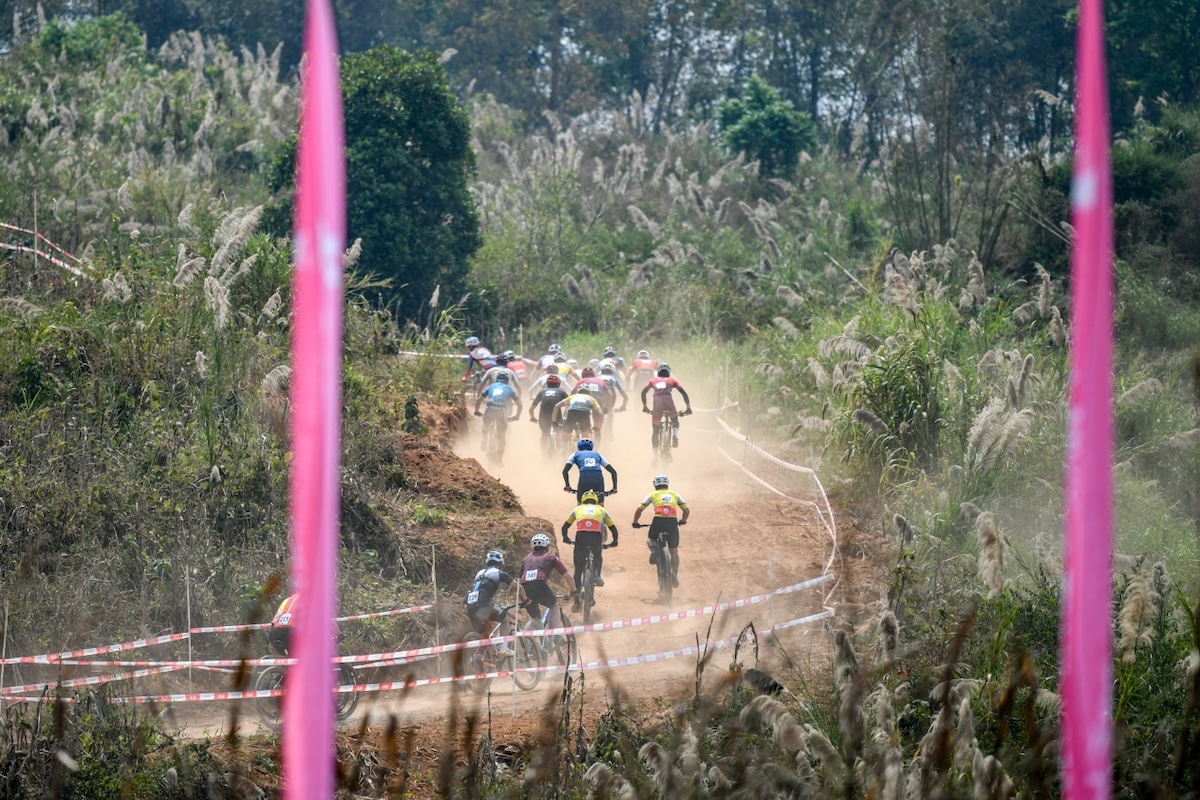 开幕式结束后,赛事随即开始,本站赛事分为2天进行,设有山地越野赛、淘汰越野赛两个大项,赛事首日,共进行了9个组别的山地越野赛项目,分别为成年男子(6圈)/女子组(5圈)、青年男子(5圈)/女子组(4圈)、公开男子A组 (3圈)、公开男子B组 (3圈)以及公开女子组 (2圈)、少年男子(3圈)/女子组(2圈)。运动员们沿着崎岖的山路骑行,越过跳台、飞包、木头桩等技术点,奋力爬坡、高速下坡,感受芒市山地的速度与激情。