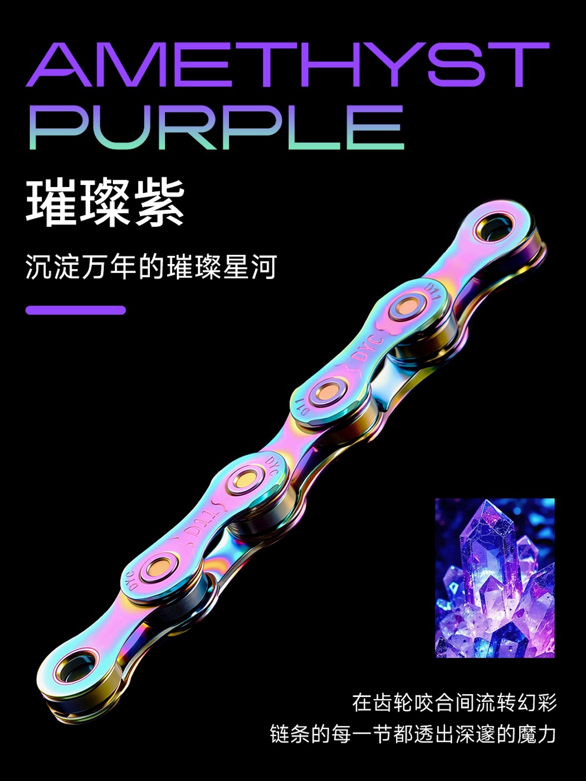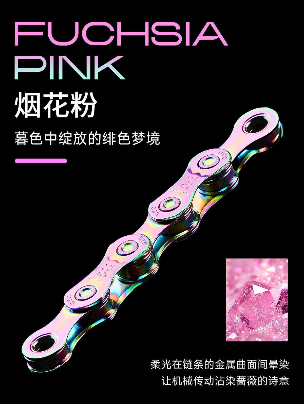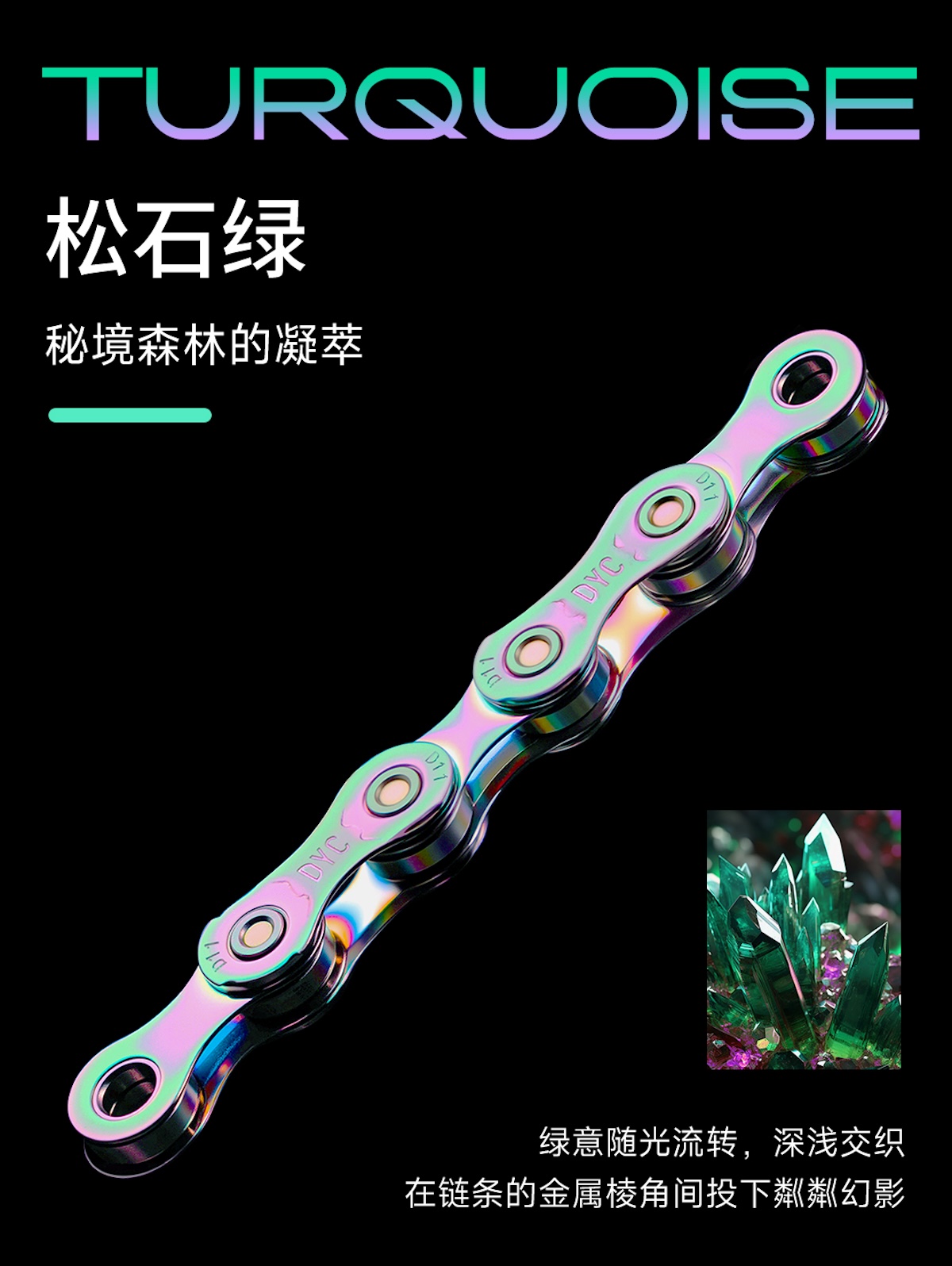 D-绮彩系列链条璀璨上市,撷取天然宝石色彩为创作灵感,融合DYC专利级燕尾桥型等设计,将天然宝石的夺目光彩凝练于金属链条,不同颜色的宝石承载不同寓意及祝福,目前上新10种颜色可供选择,让每一次骑行都闪耀非凡质感。
