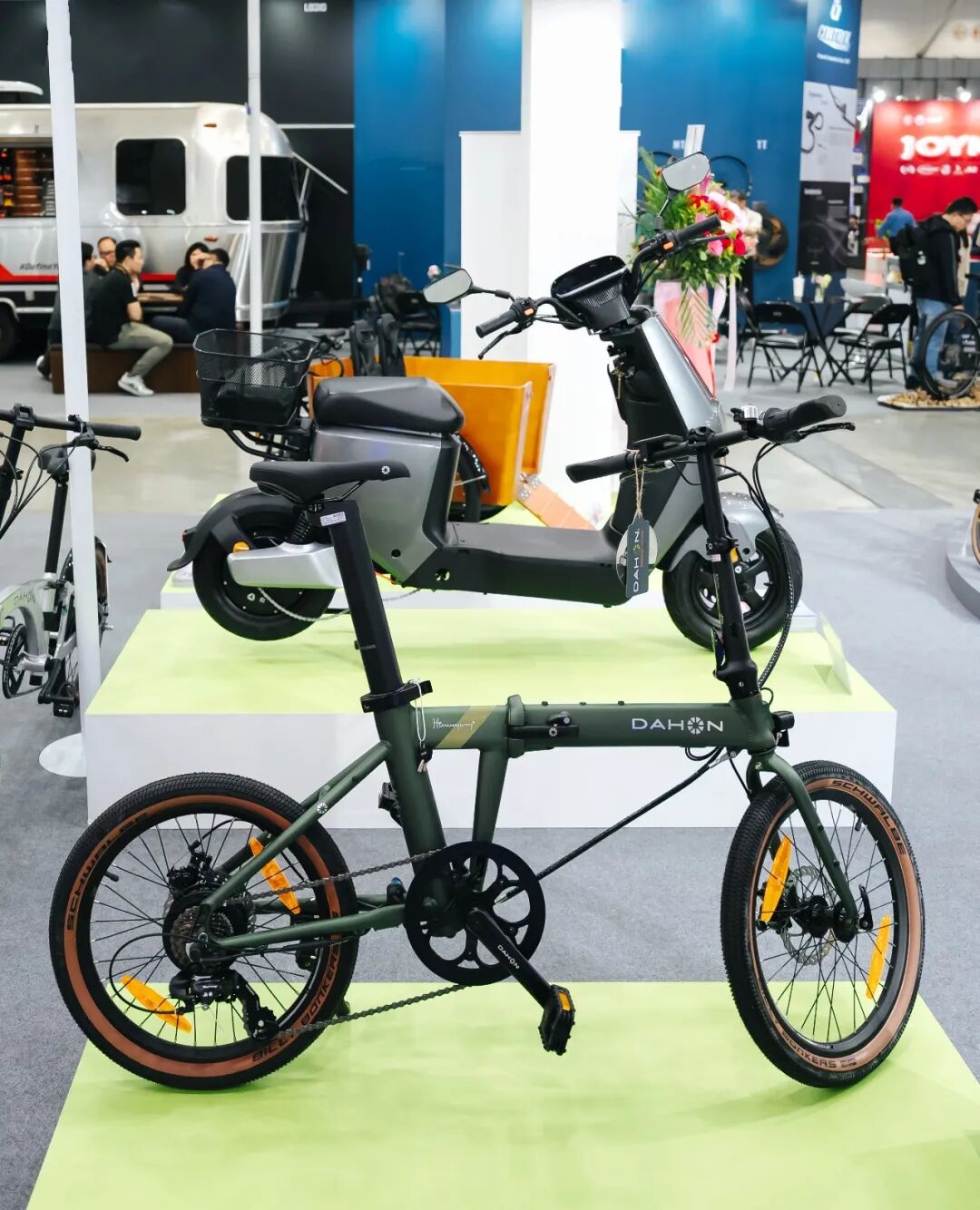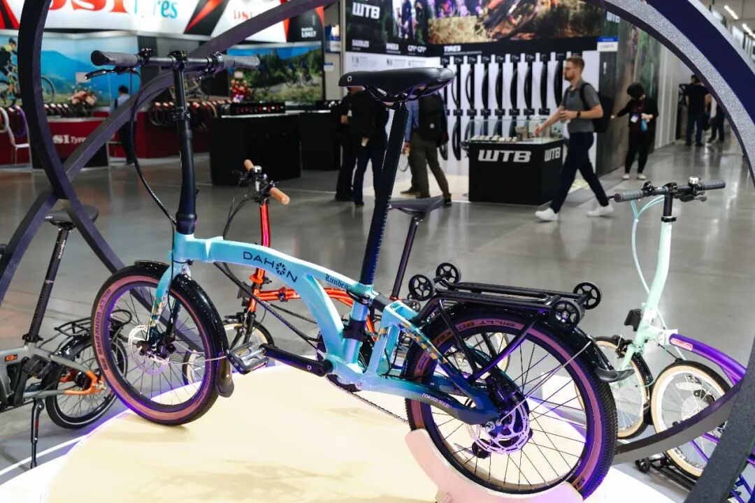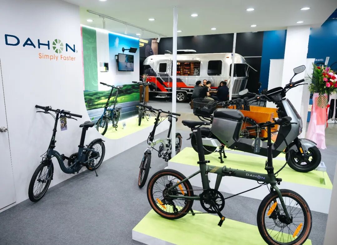 大行展位展示了全新三折叠LUNDEN、弯把折叠公路车Télodon C8 AXS、折叠电动三轮车E-CARGOE、电助力折叠自行车E-HEMINGWAY、轻快小跑K9。