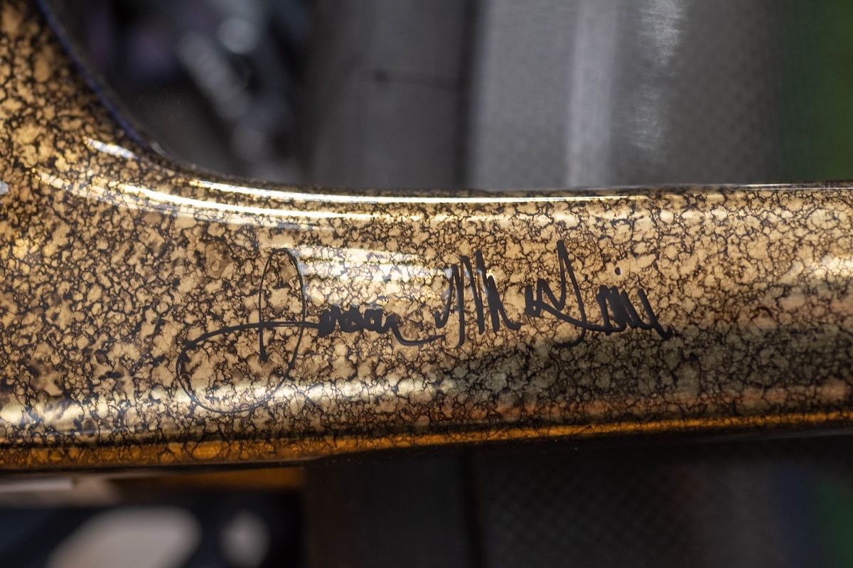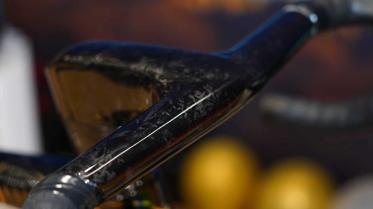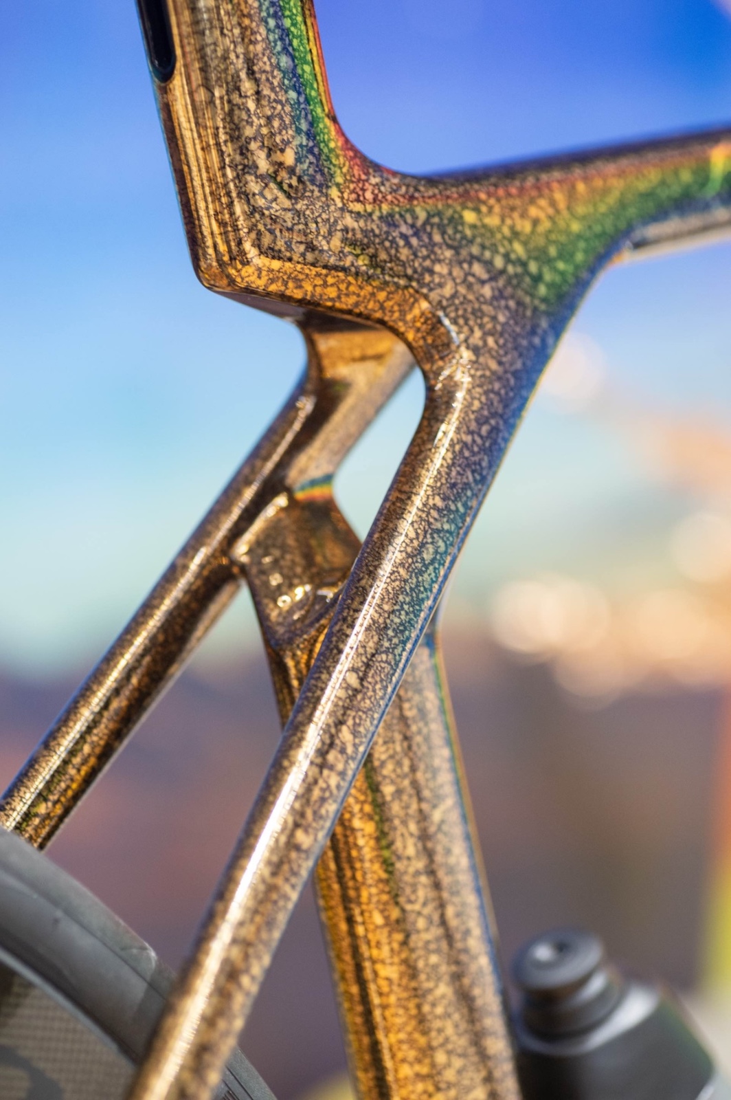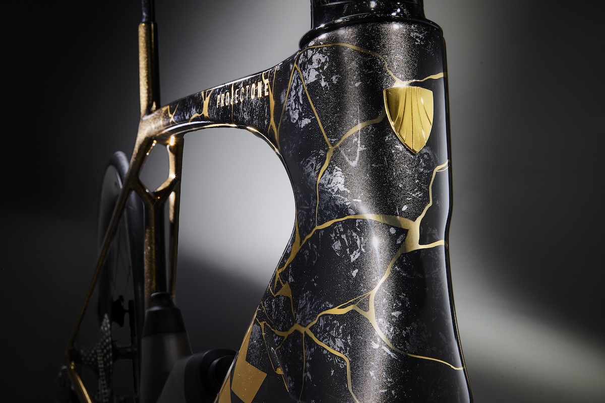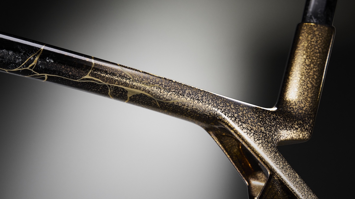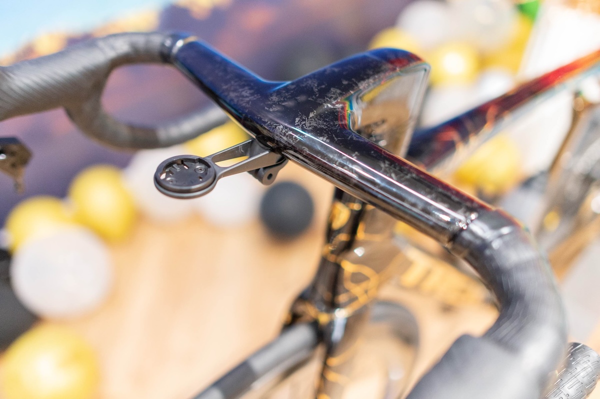 整车以深邃黑为底,锋芒金熔铸其间。光影流转间,金属质感与碳纤维肌理交织共生—不只是简单的着色车架,而且对配件如气动水壶架、一体车把也进行了定制涂装处理。