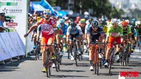 “碧桂园杯”2018第十三届环海南岛国际公路自行车赛“三亚海上大都会”赛段(五指山-三亚)在10月29日落下帷幕。在最后大集团冲刺中,前四